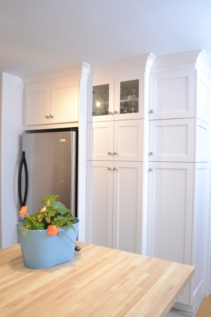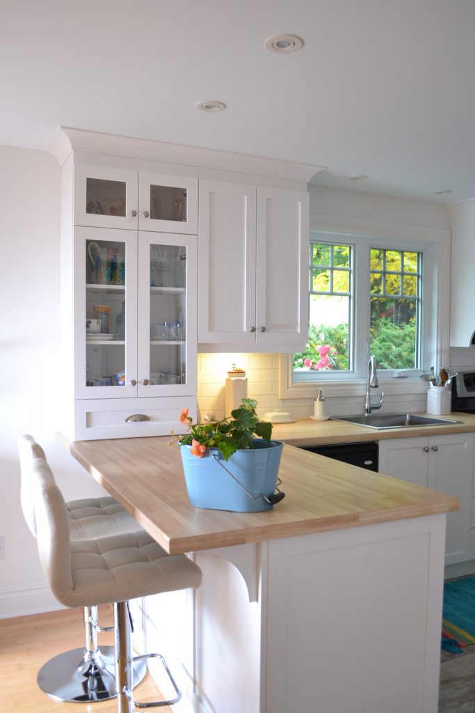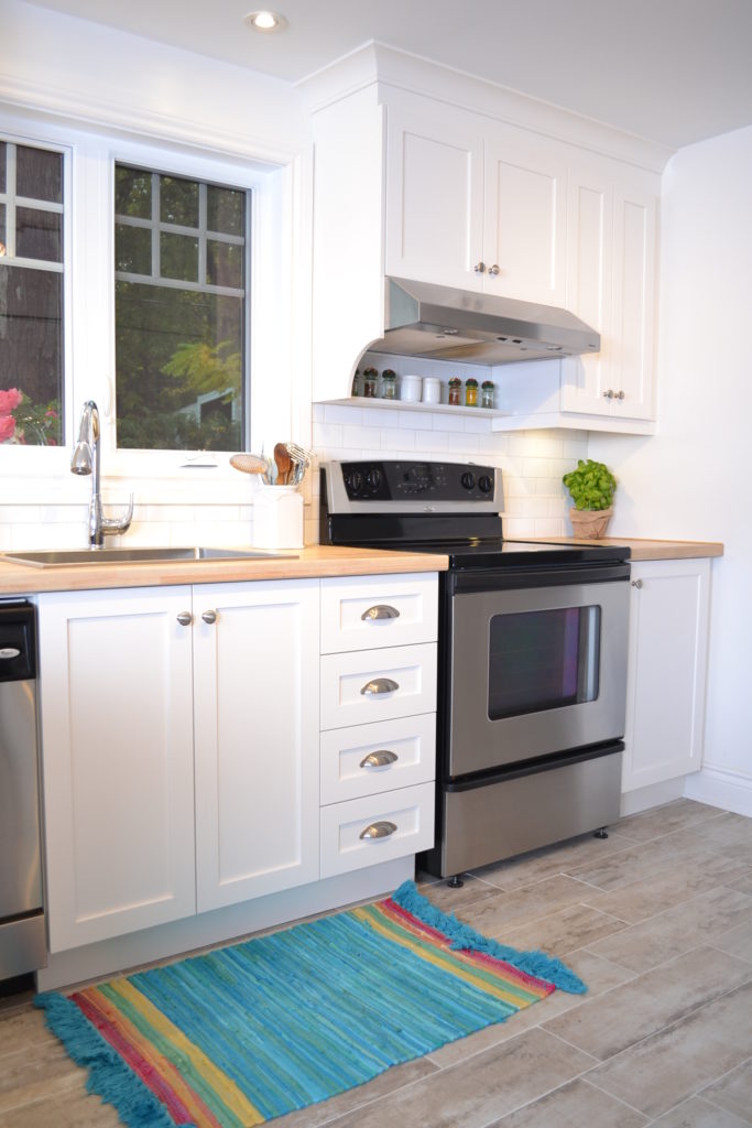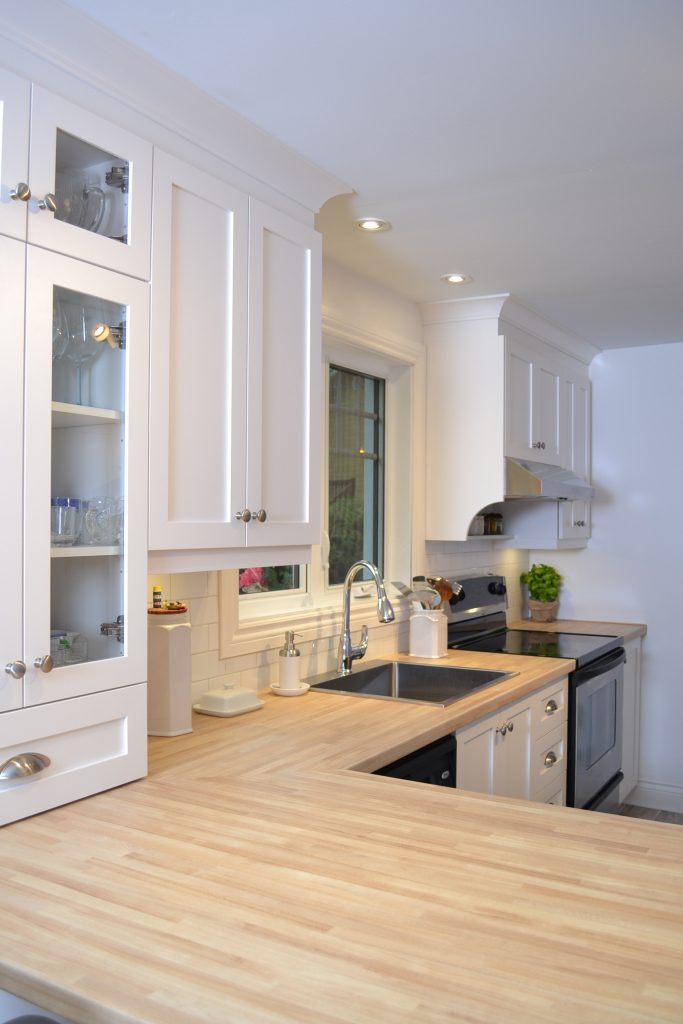Armoires de cuisine classiques rappelant le style bord de mer de la Nouvelle-Angleterre.Le choix des portes shaker blanches et du comptoir en stratifié imitation de bois fait de cette cuisine un endroit accueillant et chaleureux.